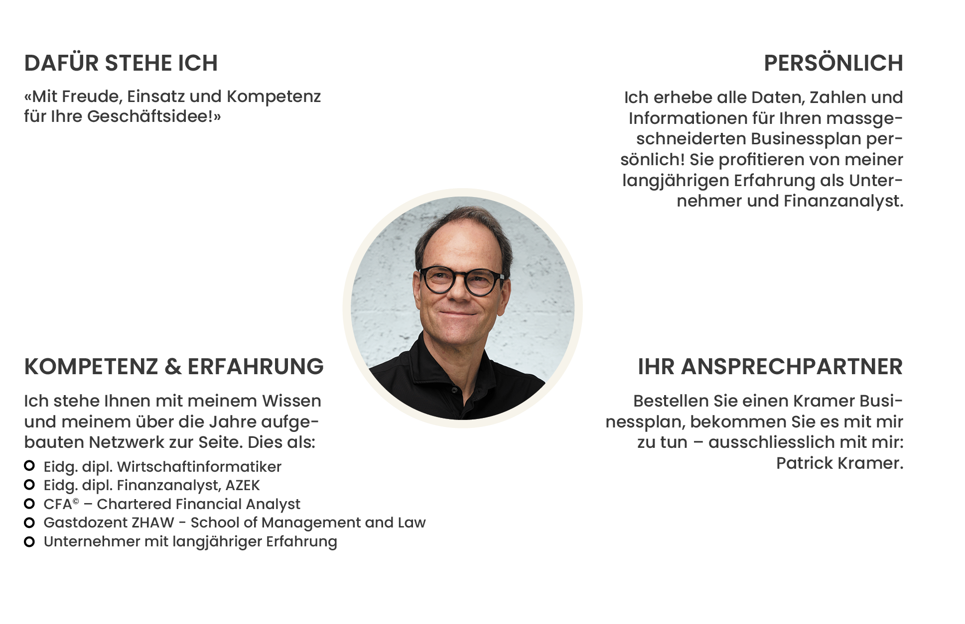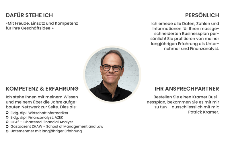 Bestellen Sie einen Kramer Businessplan, bekommen Sie es mit mir zu tun – ausschliesslich mit mir: Patrick Kramer. Ich erhebe alle Daten, Zahlen und Informationen für Ihren massgeschneiderten Businessplan persönlich! Damit sparen Sie sich das Ausfüllen zeitaufwändiger Fragebögen – und Ihr Businessplan wird nicht von anonymen, schwer erreichbaren Autor:innen irgendwo auf der Welt erstellt, sondern von mir persönlich. Jetzt Kontakt aufnehmen.
